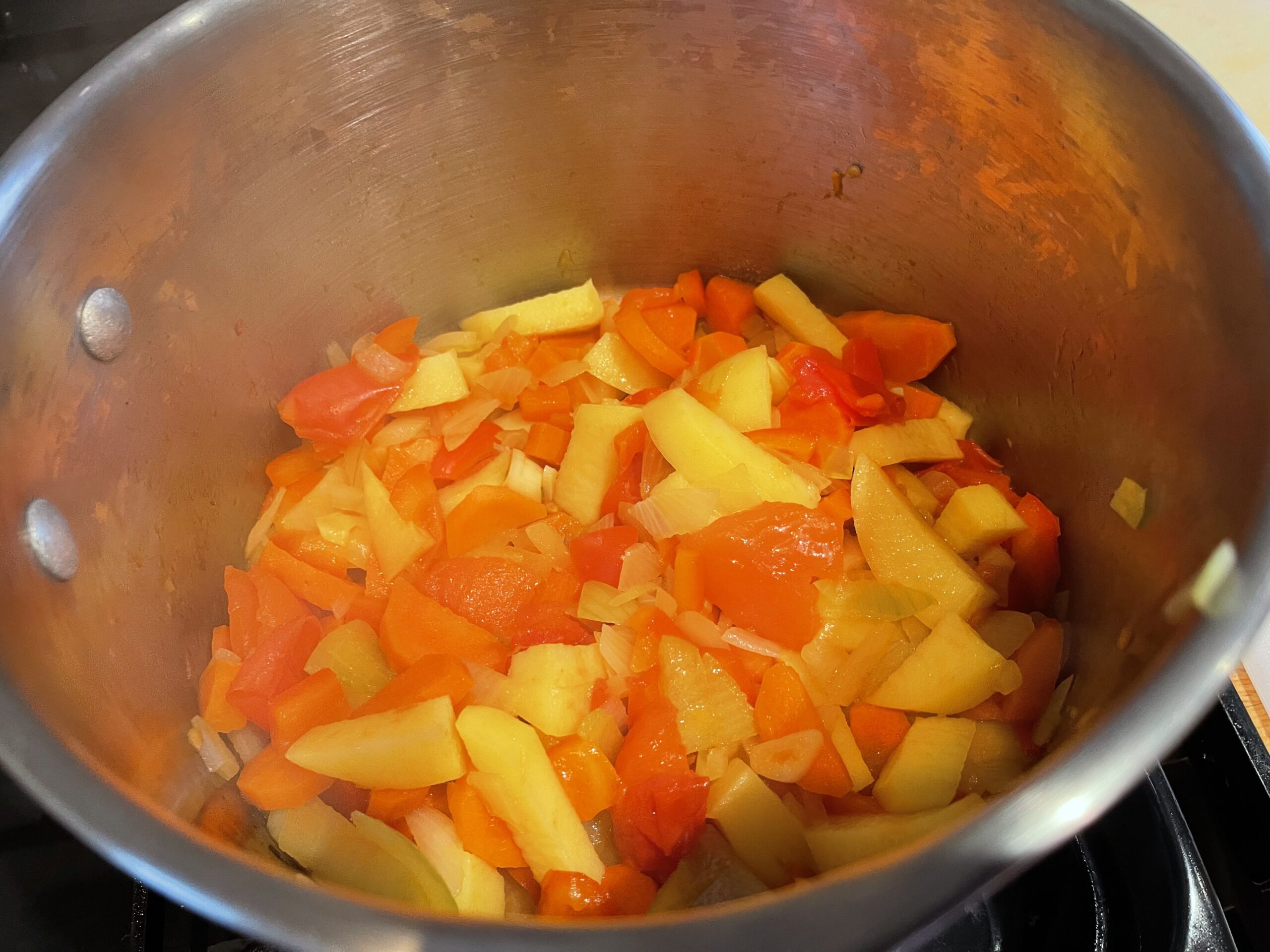- Prep the vegetables: Dice the onion, red pepper, tomato, potato, and carrot. Finely chop the garlic.